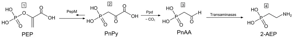 La biosíntesis de AEP comienza a partir de la reorganización del fosfoenolpiruvato (figura [1]) en fosfonopiruvato (figura [2]), una reacción catalizada por la enzima fosfoenolpiruvato mutasa (PepM). En este proceso de equilibrio, la termodinámica favorece al fosfonoenolpiruvato por un factor de al menos 500. Por lo tanto, el fosfonopiruvato tiene que convertirse rápidamente en compuestos metabólicamente útiles, favoreciendo ese desplazamiento mediante reacciones irreversibles. Una vez se ha generado el fosfonopiruvato, se descarboxila gracias a la ayuda de la enzima fosfonopiruvato descarboxilasa (Ppd), para dar fosfonoacetaldehído (figura [3]), que por transaminación genera el 2-AEP (figura [4]). La mayoría de las enzimas involucradas en la producción de estos compuestos han sido aisladas y caracterizadas y revisadas exhaustivamente:[4]