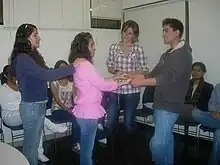Un grupo de apoyo o grupo de ayuda es una práctica psicoterapeútica que consiste en realizar reuniones regulares donde asisten pacientes y orientadores, y donde se debate y opina sobre ciertos temas (generalmente definidos de antemano), con la finalidad de hacer aflorar conflictos personales, traumas, sufrimientos, etc, y eventualmente también desarrollando reflexiones o recomendaciones sobre la forma de resolver o atemperar esas problemáticas.[45]