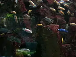 Un acuario de cíclidos africanos comúnmente consta de variedades de cíclidos del lago Tanganica o del lago Malawi, y generalmente requiere una gran cantidad de rocas combinadas con un sustrato de grava fina o arena. El entorno rocoso debería proporcionar numerosas cuevas y escondites. Debido a que los cíclidos, como los peces dorados, alteran el sustrato al excavar, se deben usar plantas de plástico como sustituto de las plantas vivas. Sin embargo, las plantas reales como Vallisneria o Anubias se pueden probar en un tanque de cíclidos.[2]