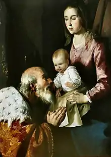 Zurbarán sigue la iconografía propia de este tema en la pintura barroca de España, estructurando el lienzo con una diagonal que separa el primer plano, donde Melchor venera al Niño Jesús, en el regazo de María. El segundo plano está ocupado por el resto de personajes. El colorido de los ropajes es espléndido, solamente atemperado por el delicado lila de las ropas de María y de Baltasar. San José es representado como un hombre joven, en segundo plano, en la penumbra. María se presenta erguida, con rostro grave y muy bello, El Niño, vivaz y simpático, se inclina tocando a Melchor con su manita derecha.[6]