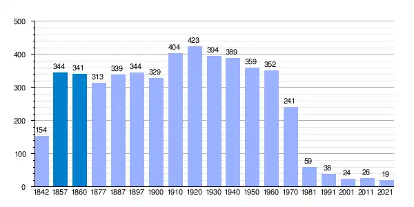 | Gráfica de evolución demográfica de Aldealcorvo[4] entre 1842 y 2021 |