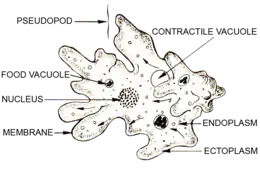 Los amebozoos (Amoebozoa) son uno de los grupos principales de protistas ameboides, incluyendo a la mayoría de los que se mueven por medio del flujo interno de citoplasma.[5] Sus seudópodos son de tipo romo y en forma de dedo y se denominan lobopodios. La mayoría son unicelulares y son comunes en el suelo y en los hábitats acuáticos. La nutrición es heterótrofa, alimentándose por fagocitosis de bacterias, protozoos o materia orgánica muerta. Algunos se encuentran en simbiosis con otros organismos, mientras que otros son patógenos. Amoebozoa incluye también Mycetozoa (mixomicetos o mohos mucilaginosos), formas multinucleadas o multicelulares que producen esporas y que son generalmente visibles a simple vista. Las células de los amebozoos pueden estar desnudas o cubiertas por una testa y a veces presentan flagelos. El grupo comprende unas 4200 especies conocidas.[6]