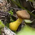 Cuando los cuerpos frutales son jóvenes, la parte inferior de las tapas tiene una capa algodonosa de tejido que se extiende desde el borde de la tapa hasta el tallo, un velo parcial, que sirve para proteger las branquias en desarrollo. A medida que el tapón aumenta de tamaño, la membrana finalmente se separa de la tapa para exponer las branquias. Las branquias tienen una unión adnata (unida de forma cuadrada) a algo decurrente (que se extiende por la longitud del tallo) hacia el tallo. Inicialmente son blancos, pero envejecen a una naranja cremosa o pálida cubierta con manchas de color óxido. El tallo mide 4-10 cm (1.6-3.9 pulg) de largo y 0.6-1.8 cm (0.24-0.71 pulg) de grosor, y casi en forma de maza con una base de hasta 1.3-2.7 cm (0.5-1.1 pulg) de grosor. Por encima del nivel del anillo , el tallo es de color naranja pálido a marrón, mientras que debajo es de color blanquecino o rosa pálido, y se vuelve marrón grisáceo en la base. El anillo se coloca alrededor de 0.4-0.9 cm (0.16-0.35 in) por debajo del nivel de la tapa, y puede estar cubierto de micelio algodonoso de color amarillento a pardo pálido. La base del tallo está unida a los rizomorfos , estructuras en forma de raíz negras de 1-3 mm de diámetro. Si bien la función principal de los micelios subterráneos es absorber los nutrientes del suelo, los rizomorfos cumplen una función más exploratoria, para localizar nuevas bases de alimentos.[23][24]