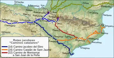 - Una variante de la anterior ruta es el denominado «Camino de Santiago de Montserrat a San Juan de la Peña» que, con 316 km de recorrido, parte del citado monasterio y tras un tramo en común hasta Tárrega, continúa al pie del Pirineo por Balaguer, Alfarrás, Monzón y Huesca, se interna en la montaña para llegar al monasterio de San Juan de la Peña y conecta con la entrada aragonesa del «Camino Francés».[16]