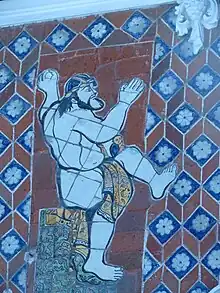 El conjunto es un extraordinario ejemplo de fachada barroca poblana: en la base, lambrín de cantera gris; sobre este, un tapetillo formado por ladrillos de arcilla roja y azulejos. Y lo más llamativo: formados con mosaico de azulejo, dieciséis figuras antropomorfas presentadas en un momento que detiene sus movimientos.