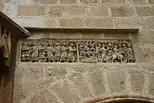 La puerta románica (del lado del evangelio), del siglo XIII da acceso al claustro desde la iglesia. Presenta un dintel de mármol y un tímpano esculpido con Maiestas Domini y el Tetramorfos, con tres arquivoltas de perfil semicircular con capiteles decorados con follaje naturalista copiado de monumentos romanos y con escenas de la visita de las tres Marías al sepulcro de Cristo, las impostas de esta puerta están decoradas con cenefas de hojas y palmas. El mainel está constituido por una columna de fuste monolítico con la base decorada con reptiles y el capitel piramidal invertido representando en sus caras escenas de la vida infantil de Jesús: la epifanía, la natividad, la adoración de los magos y la visita de los magos a Herodes. En la parte superior sobre esta puerta se encuentra un crismón con el anagrama de Alfa y Omega.[24]