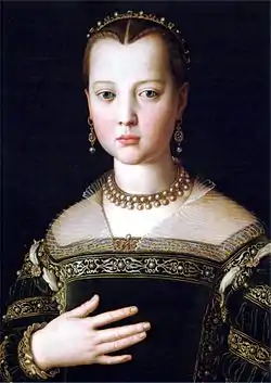 ![]() Retrato de Cosme I por Agnolo Bronzino, c. 1545 (óleo sobre tabla, 117,5 × 98,5 cm, Galería de Arte de Nueva Gales del Sur) | ||