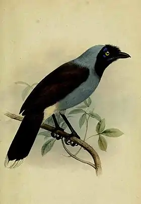 ![]() Cyanocorax hafferi, ilustración basada en dibujo de Cyanocorax heilprini por Joseph Smit, 1898. | ||