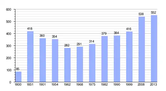 Los datos demográficos contemplados en este gráfico de la comuna de Derchigny[4] se han cogido de 1800 a 1999 de la página francesa EHESS/Cassini, y los demás datos de la página del INSEE.[5]