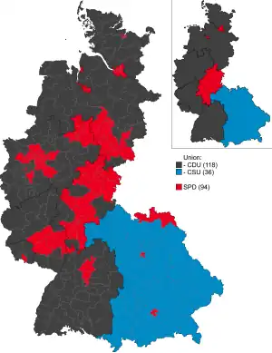 A pesar de las secuelas del Escándalo Spiegel, que llevaron a la renuncia de Konrad Adenauer y su reemplazo por Ludwig Erhard, la popularidad personal de este último como Ministro de Finanzas responsable del milagro económico alemán llevó a que la oficialista Unión o CDU/CSU (frente formado por la Unión Demócrata Cristiana y la Unión Social Cristiana de Baviera) obtuviera una quinta victoria consecutiva con el 47.59% del voto popular, revalidando exactamente los 251 escaños que había logrado en la elección anterior, aunque con la variación de que la CDU ganó una banca y la CSU perdió otra. El Partido Socialdemócrata de Alemania (SPD), principal partido de la oposición, que se presentaba bajo la candidatura de Willy Brandt, logró por cuarta vez experimentar crecimiento de votos y escaños, siendo para entonces el único partido que había participado desde las elecciones de 1949 sin sufrir debacles, aunque estuvo todavía muy lejos de alcanzar al oficialismo con un 39.28% y 217 escaños, lo que fue, sin embargo, su mejor resultado histórico hasta el momento. El Partido Democrático Libre (FDP), muy debilitado por su apoyo al último mandato de Adenauer, obtuvo el 9.49% de los votos y 50 escaños. Si bien logró por segunda vez monopolizar los escaños restantes entre la CDU/CSU y el SPD, conservando su posición de tercero definitorio, perdió 17 bancas y casi un millón de votos.
