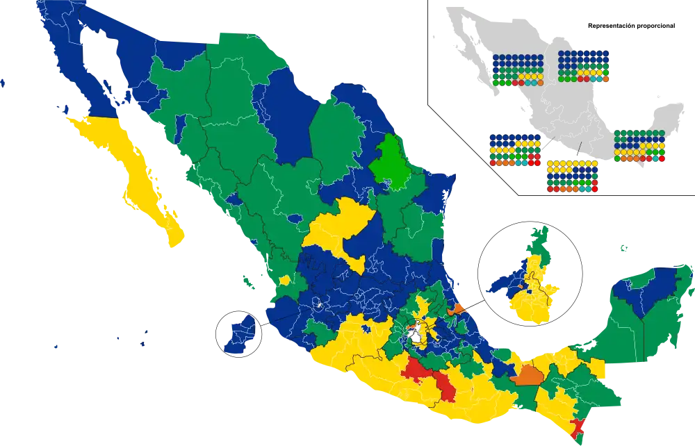 - 500 Diputados Federales. Miembros de la cámara baja del Congreso de la Unión, 300 elegidos de manera directa por cada distrito uninominal y 200 elegidos indirectamente a través de un sistema de listas nacionales por cada una de las 5 circunscripciones en las que se divide el país, todos por un periodo de tres años, que comenzó el 1 de septiembre de 2006.