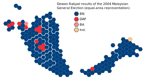 | Elecciones federales de 2004 219 escaños del Dewan Rakyat 110 escaños necesarios para la mayoría (Miembros electos) | |||||||||||