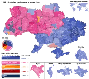 El Partido de las Regiones obtuvo el mayor número de escaños, mientras que Patria (con varios partidos juntos como partido "paraguas") quedó en segundo lugar.[16] Las elecciones también se caracterizaron por el ascenso del partido de extrema derecha Svoboda, que quedó en cuarto lugar.[16] El nuevo partido Alianza Democrática Ucraniana para la Reforma (UDAR) (en el panorama nacional) también obtuvo un gran éxito con su tercer puesto en las elecciones.[16] El Partido Comunista de Ucrania, de extrema izquierda, casi triplicó su número de votantes, pero debido al sistema electoral mixto utilizado en las elecciones, sólo obtuvo cinco escaños más que en las elecciones anteriores, con el mismo numero de escaños totales.[16] Gracias a este sistema mixto, tres partidos pequeños y 43 políticos independientes también llegaron al parlamento.[16]