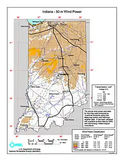 ![]() Mapa de densidad de energía eólica anual promedio para Indiana a 50 m sobre el suelo | |||||||||||||||||||||||||||||||||||||||||||||