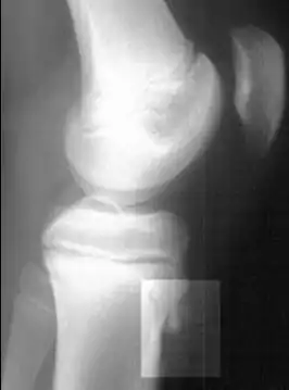 ![]() Radiografía lateral de la rodilla demostrando fragmentación del tubérculo tibial, con tejido sobreabundante | ||