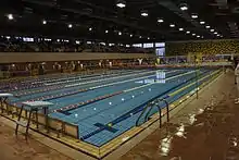 Otro edificio digno de reseñar es la Piscina cubierta, de ocho calles, climatizada, homologada para competiciones internacionales con un amplio graderío para un aforo para 500 espectadores.