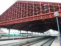 Sobre los andenes destaca una amplia marquesina de dos vertientes construida en hierro y cristal de 356 toneladas de peso y unas medidas de 102 x 35 metros.[9] Cuenta con elementos decorativos tanto en los capiteles de las columnas que sostienen la estructura como en los cuerpos mensulados o en los broches de remate.