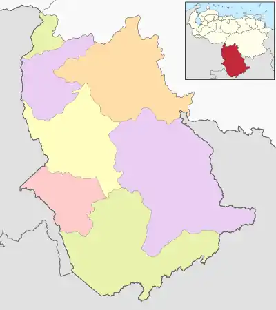 Norte: Bolívar Noroeste: Apure Sur: Roraima en Brasil Este: Bolívar y Amazonas en Brasil Oeste: Guainia y Vichada en Colombia | ||||||
