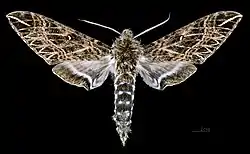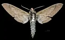 Su envergadura es de aproximadamente 117 mm. tiene tres filas de manchas blancas en cada lado del abdomen y una mancha blanca grande en la base de la región ventral del abdomen.