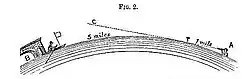 If the earth is a globe, and is 25,000 English statute miles in circumference, the surface of all standing water must have a certain degree of convexity—every part must be an arc of a circle. From the summit of any such arc there will exist a curvature or declination of 8 inches in the first statute mile. In the second mile the fall will be 32 inches; in the third mile, 72 inches, or 6 feet, as shown in the following diagram:...[A]fter the first few miles the curvature would be so great that no difficulty could exist in detecting either its actual existence or its proportion... In the county of Cambridge there is an artificial river or canal, called the "Old Bedford". It is upwards of twenty miles in length, and ... passes in a straight line through that part of the Fens called the "Bedford Level". The water is nearly stationary—often completely so, and throughout its entire length has no interruption from locks or water-gates of any kind; so that it is, in every respect, well adapted for ascertaining whether any or what amount of convexity really exists. Earth's rate of curvature as shown in Zetetic Astronomy. Vertical exaggeration 1000×.Si la tierra es un globo y tiene 25.000 millas terrestres inglesas de circunferencia, la superficie de toda el agua estancada debe tener un cierto grado de convexidad: cada parte debe ser un arco de círculo. Desde la cumbre de cualquiera de tales arcos existirá una curvatura o declinación de 8 pulgadas en la primera milla terrestre. En la segunda milla la caída será de 32 pulgadas; en la tercera milla, 72 pulgadas o 6 pies, como se muestra en el siguiente diagrama:... [D]espués de las primeras millas, la curvatura sería tan grande que no podría existir dificultad para detectar su existencia real o su proporción ... En el condado de Cambridge hay un río o canal artificial, llamado "Viejo Bedford". Tiene más de veinte millas de largo y ... pasa en línea recta a través de esa parte de los pantanos llamada "Bedford Level". El agua está casi estancada, a menudo por completo, y en toda su longitud no tiene interrupción de esclusas o compuertas de ningún tipo; de modo que, en todos los aspectos, está bien adaptado para determinar si realmente existe alguna o qué cantidad de convexidad. Tasa de curvatura de la Tierra como se muestra en Zetetic Astronomy. Exageración vertical 1000×.