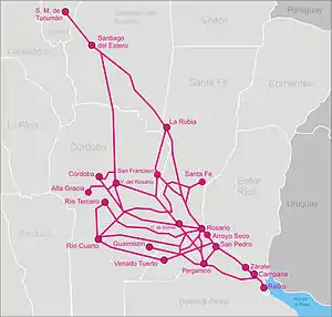 Retiro Campana Zarate Baradero Empalme Villa Constitución San Nicolás Rosario Sur Rosario Norte Villa María Córdoba Santa Fe Rafaela La Banda Tucumán | |||