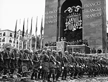 Tras el final de la guerra civil se acentuaron los vínculos de la dictadura franquista con los regímenes fascistas.[27] El 7 de abril de 1939, solo una semana después de la emisión del último parte de la Guerra Civil Española, el general Franco anunciaba la adhesión al Pacto Antikomintern que habían suscrito Alemania, Italia y Japón.[28][29][30] Al día siguiente anunciaba también el abandono de España de la Sociedad de Naciones, cumpliendo así la promesa hecha a Mussolini.[31]