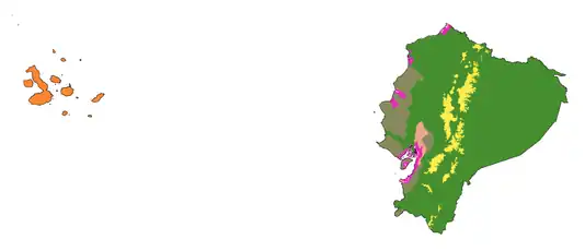 La Cordillera de los Andes se constituye por una doble cadena montañosa que presenta grandes ramificaciones hacia los flancos exteriores (occidentales y orientales) dividiendo al territorio continental en tres regiones: Costa, Sierra y Oriente. Además del área continental, se integra al país; la región insular conformada por islas emergentes del Océano Pacífico por las erupciones volcánicas submarinas.[8]