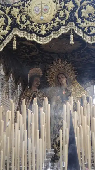 La Virgen de los Dolores y Misericordia va acompañada en el paso de palio por san Juan. Antonio Eslava hizo a la Virgen en 1962 y San Juan fue tallado por Juan Ventura en 1981. La orfebrería es obra de Hijos de Juan Fernández y Manuel de los Ríos. Los respiraderos del paso son de Cayetano González. Las bambalinas del paso de palio son azul oscuro bordadas en oro, en el taller de José Antonio Grande de León. Fueron estrenadas en el año 2007. Las anteriores, obra de las hermanas Antúnez y que en su día fueron adquiridas a la hermandad de la Carretería, pasaron al interior. El manto, del mismo color y taller, fue estrenado en 2012.