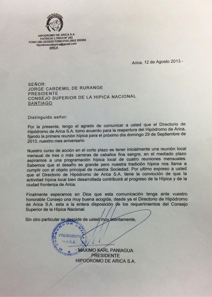 El 12 de agosto de 2013 y tras 12 años de inactividad (desde el 25 de febrero de 2001),[5] se anunció la reapertura del Hipódromo de Arica,[6][7] el cual fue reinaugurado el 13 de octubre de 2013.[8][9] Se realizaron 16 reuniones de carreras entre 2013 y 2015.