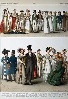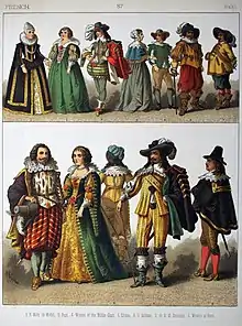 En la segunda mitad del siglo XIV estuvo de moda la hopalanda (houppelande), una capa larga de uso tanto masculino como femenino, que podía ser sin mangas o con ellas, siendo entonces de forma acampanada o de saco; solía confeccionarse con telas de distinto color en cada lado del cuerpo (mi-parti).[54] Surgida hacia 1360, la hopalanda era una sobrevesta de estructura ancha y abierta por delante, de materiales ricos y muy decorada. Los hombres la llevaban sobre el jubón y las calzas, hasta el muslo o las pantorrillas, con anchas mangas que se recogían en los hombros. La mujer la llevaba cerrada por delante, con largo hasta el suelo y, en ocasiones, con cola; tenía igualmente las mangas anchas y los pliegues se sujetaban bajo el pecho en un talle alto. Por lo general, las mangas y los dobladillos tenían flecos o festones en colores distintos a los de la prenda, para contrastar.[57] Desde la segunda mitad del siglo XV la hopalanda, conocida más entonces como gown, pasó a ser usada principalmente por ancianos o bien por doctores y magistrados.[58]