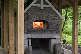 El diseño tradicional de mampostería con fuego directo suele denominarse "horno romano" u "horno negro" y se le conoce en la cultura occidental desde, al menos, la República romana. Se le conoce como horno negro porque el fuego genera hollín en el techo del horno. Los hornos negros solían construirse para dar servicio a comunidades enteras (compárese con los hornos banales de Francia u hornos comunitarios en España y Portugal, que solían ser propiedad del gobierno local y cuyos operarios cobraban una tarifa a los usuarios del horno).[5][6] Este tipo de hornos se popularizaron en América durante la época colonial. Su uso está muy extendido en panaderías, pastelerías y pizzerías artesanales, restaurantes que ofrecen pizzas y platos al horno, y cada vez más, como pequeños hornos de patio o domésticos.
