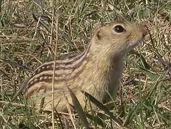 La ardilla de tierra de trece franjas (Ictidomys tridecemlineatus), llamada también ardilla de tierra o tuza listada, suslik de trece bandas, y espermofilo leopardo en la época de John James Audubon,[2] es una especie de roedores en la familia Sciuridae.[3] Se distingue por tener trece franjas marrón y blancas alternadas a lo largo de su zona dorsal y lateral, que pueden separarse en cadenas de puntos.[4]