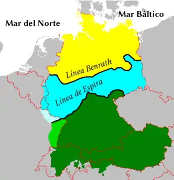 Se pueden dividir los dialectos entre los del «bajo alemán» y los del «alto alemán». La separación entre ambas zonas viene dada por la llamada línea de Benrath, la cual separa las zonas que sufrieron la segunda mutación consonántica germánica[21] de las que no la sufrieron. Esa mutación se produjo alrededor del año 500 d. C. en los pueblos al sur de esta línea; los dialectos de estos pueblos han dado lugar al alto alemán actual. Los dialectos de los pueblos al norte de esta línea han dado lugar al inglés, el neerlandés, el frisón y los dialectos del bajo alemán.