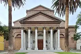 En su fachada principal se pueden observar diferentes detalles, partiendo por su acceso; en el cual podemos observar seis columnas de fuste liso (en mármol); en su parte superior, se reconoce el capitel de orden corintio. Sobre las columnas encontramos el arquitrabe y el frontón.