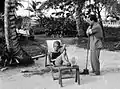 Enrique Gutiérrez y Simón, carga un chasis con película en la cámara, montada sobre una bicicleta de carga, para hacer un travelling, de la película Isla de Ensueño, en una calle de San Andrés
