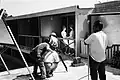 Preparando una escena en el jardín del hotel. Florentino Gutiérrez, Gilberto Pizano Arroyave (asistente de cámara) y Enrique Gutiérrez y Simón en la cámara y sentadas Sandra Scott e Ivonne Yamile.