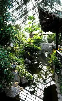 - Jardín Chino - corriente de agua con kois y formaciones rocosas, con bambú, árbol del alcanfor, Lamprocapnos spectabilis, tulipanes, y jazmines.