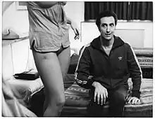 En primer plano, sentados en sillones, Linn Alison y Julio López, Rudy Chernicoff y Érika Wallner. Detrás Marcela López Rey con Alberto Anchart y Juan Carlos Galván con Susana Kamini, en la película Hay que parar la delantera (1977). Fotografía blanco y negro sobre papel fotográfico brillante.