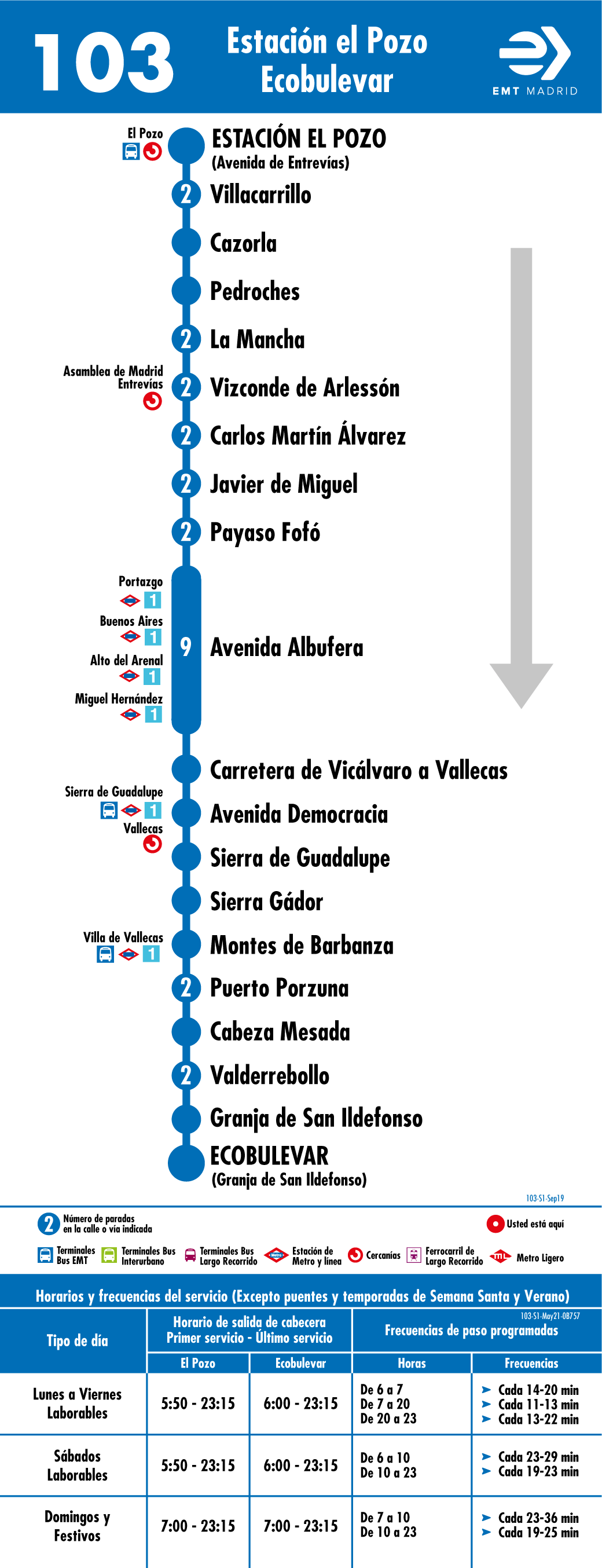 La línea 103 de la EMT de Madrid une la estación de El Pozo con el Ecobulevar de Vallecas.