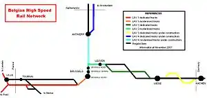 ![]() Mapa esquemático de la red belga de alta velocidad a noviembre de 2007.[1] | ||||||||||||||||||||||||||||||||||||||||||||||||||||||||||||||||||||||||||||||||||||||||||||||||||||||||||||