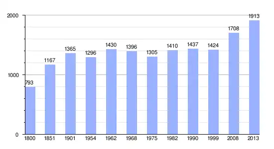Los datos demográficos contemplados en este gráfico de la comuna de La Pouëze[4] se han cogido de 1800 a 1999 de la página francesa EHESS/Cassini, y los demás datos de la página del INSEE.[5]