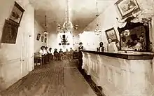 El interior del verdadero Long Branch Saloon en Dodge City, Kansas, fotografiado entre 1870 y 1885.