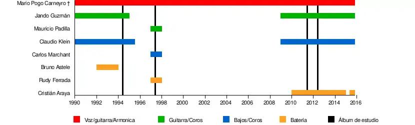 - Mario "Pogo" Carneyro † – voz, armónica, guitarra (1990–1998, 2009–2022)