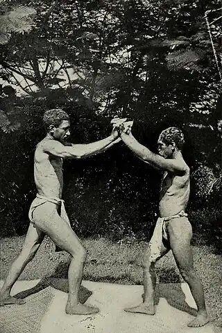 ![]() Dos hombres nativos hawaianos practicando lua. | ||