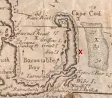 Una marca x que marca el lugar del naufragio del Whydah Gally en Cabo Cod.
