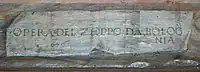 Firma de Marco Zoppo en el retablo del Real Colegio de España, Bolonia.