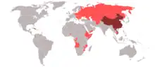 Un nuevo frente de revolución marxista-leninista estalló en África entre 1961 y 1979. Angola, Benín, Congo, Etiopía, Mozambique y Somalia se convirtieron en estados marxista-leninistas gobernados por sus respectivos pueblos nativos durante el período 1968-1980. Las guerrillas marxista-leninistas lucharon en la guerra colonial portuguesa (1961-1974) en tres países, a saber, Angola, Guinea-Bissau y Mozambique.[156] En Etiopía, una revolución marxista-leninista depuso la monarquía del emperador Haile Selassie (1930-1974) y estableció el gobierno de Derg (1974-1987) del Gobierno Militar Provisional de la Etiopía Socialista. En Rhodesia (1965-1979), Robert Mugabe dirigió la Guerra de Liberación de Zimbabue (1964-1979) que depuso el gobierno de la minoría blanca y luego estableció la República de Zimbabue.