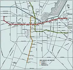 La Línea 1 es la línea inaugural de la red y es el eje principal de esta, siendo la única que recorre la ciudad en sentido poniente-oriente. El recorrido completo de la línea, identificada con el color rojo, tarda aproximadamente 29,7 minutos.[83]