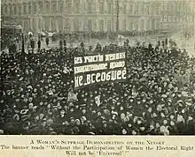 La Declaración de los Derechos de la Mujer y de la Ciudadana fue un texto redactado en 1791 por Olympe de Gouges[31][32] parafraseando la Declaración de Derechos del Hombre y del Ciudadano del 26 de agosto de 1789, el texto fundamental de la revolución francesa. Es uno de los primeros documentos históricos que propone la emancipación femenina en el sentido de la igualdad de derechos o la equiparación jurídica y legal de las mujeres en relación con los varones.