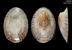 La concha es cónica y baja, y alcanza una longitud máxima de hasta unos 50 mm de largo. Es relativamente alta, en general gruesa, y presenta el ápex en posición anterior y curvado hacia delante, central o subcentral. La superficie externa es opaca, de color pardo grisáceo. Presenta la escultura compuesta por costillas radiales gruesas, rugosas o escamadas por la intersección con las líneas de crecimiento.[2]